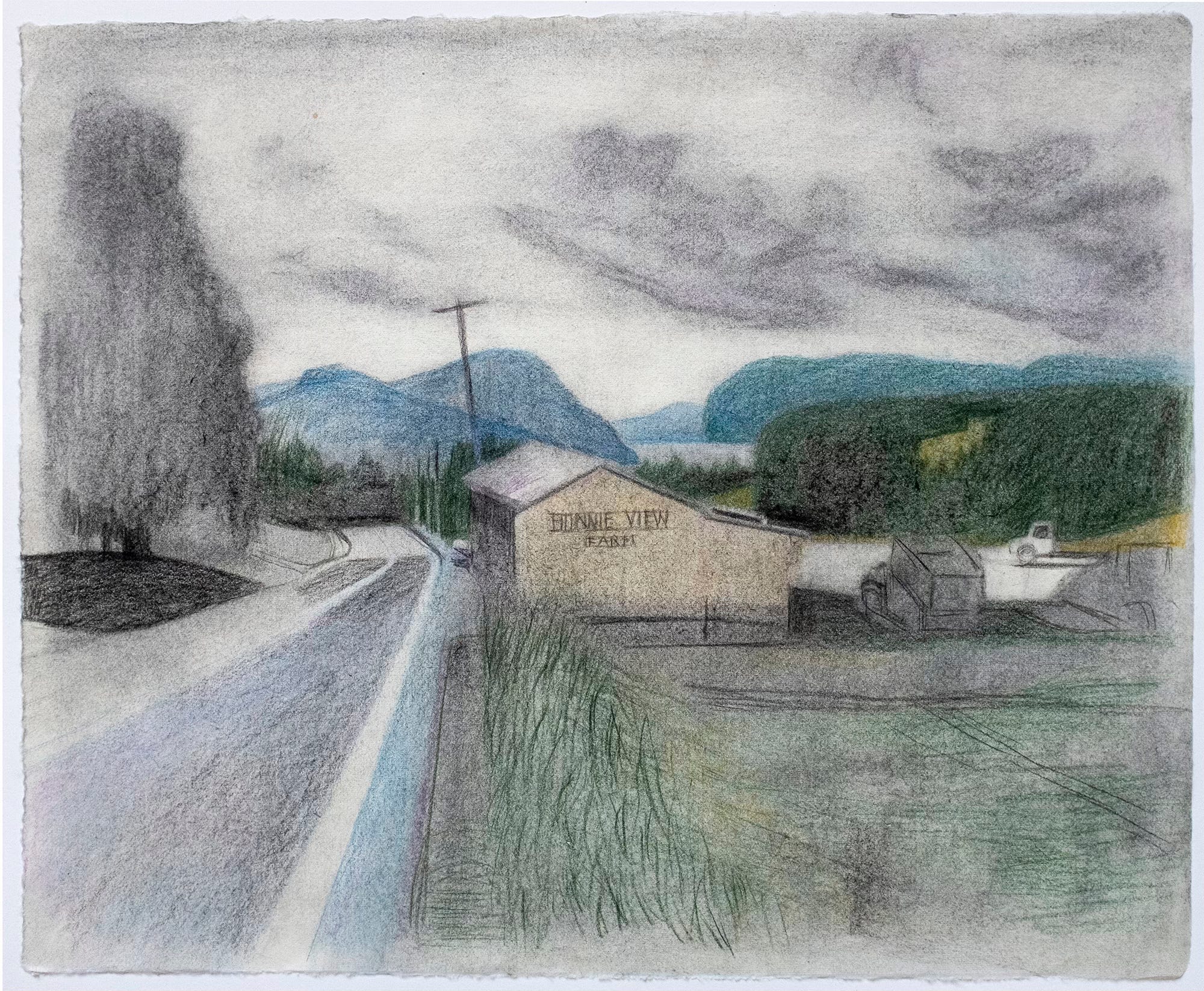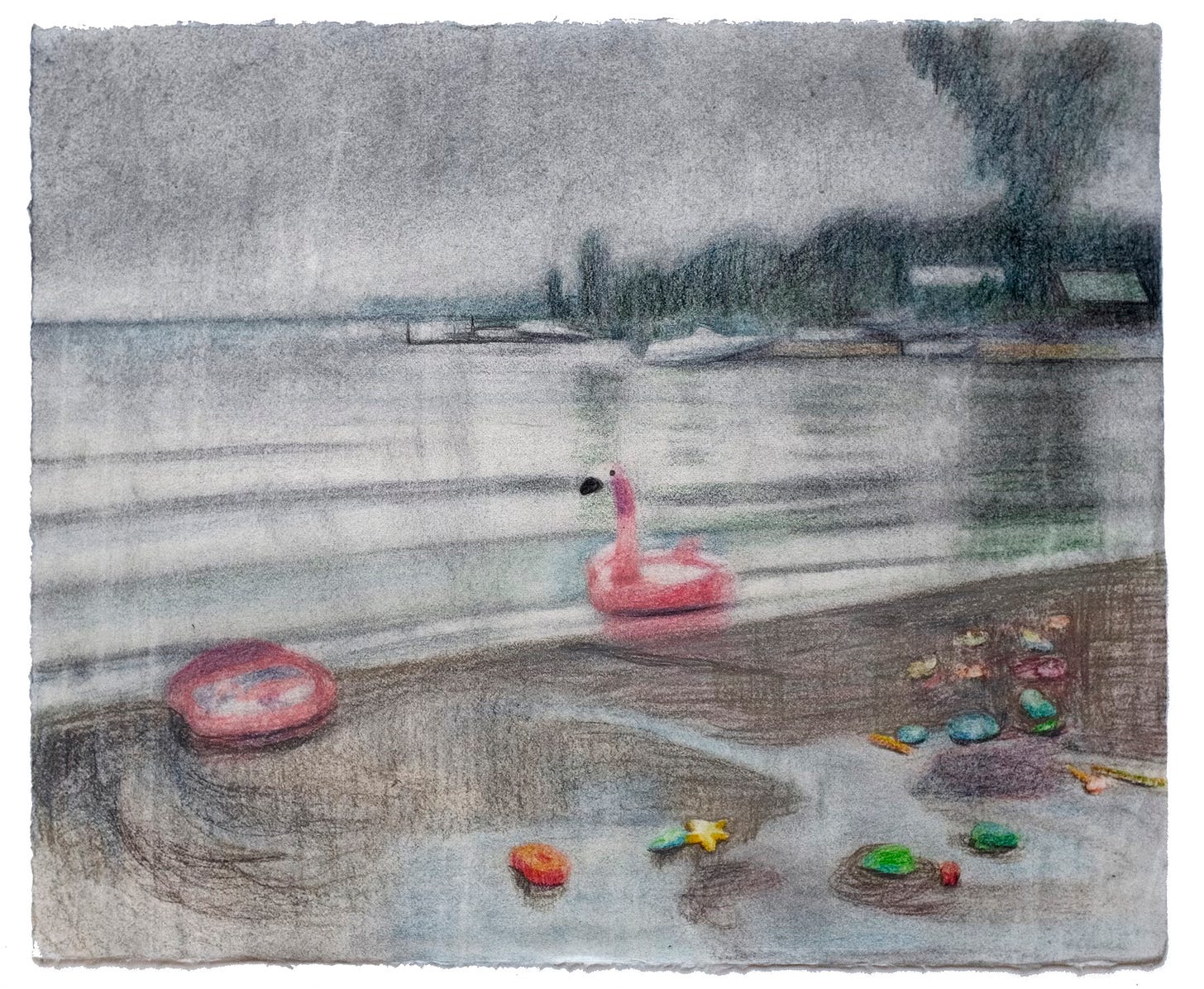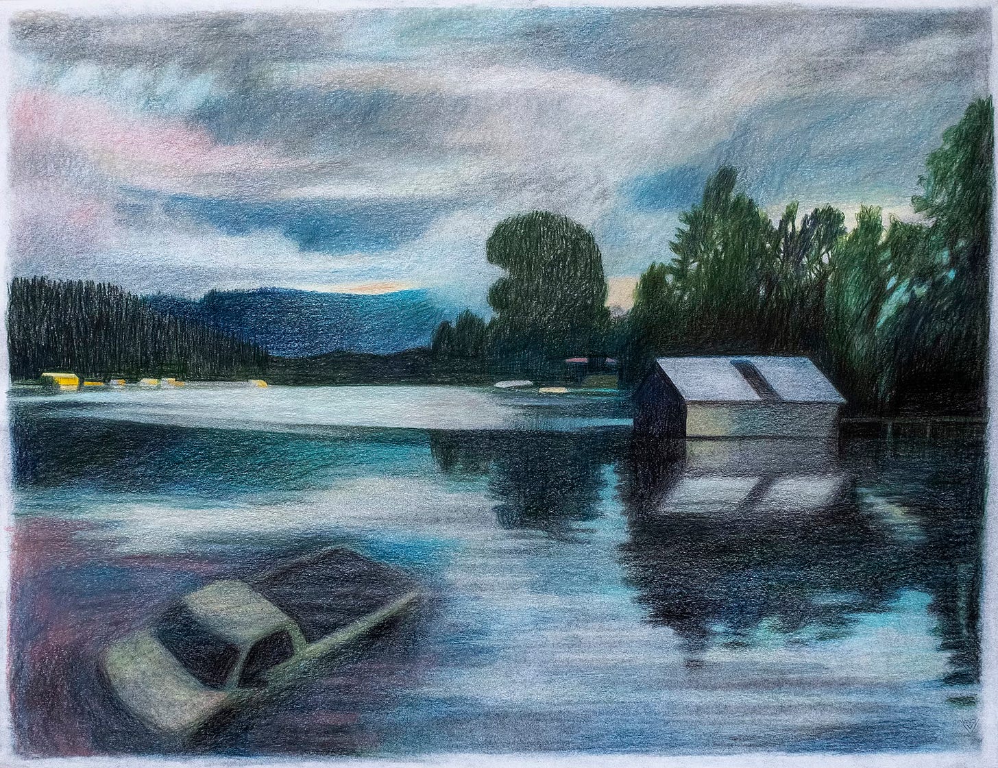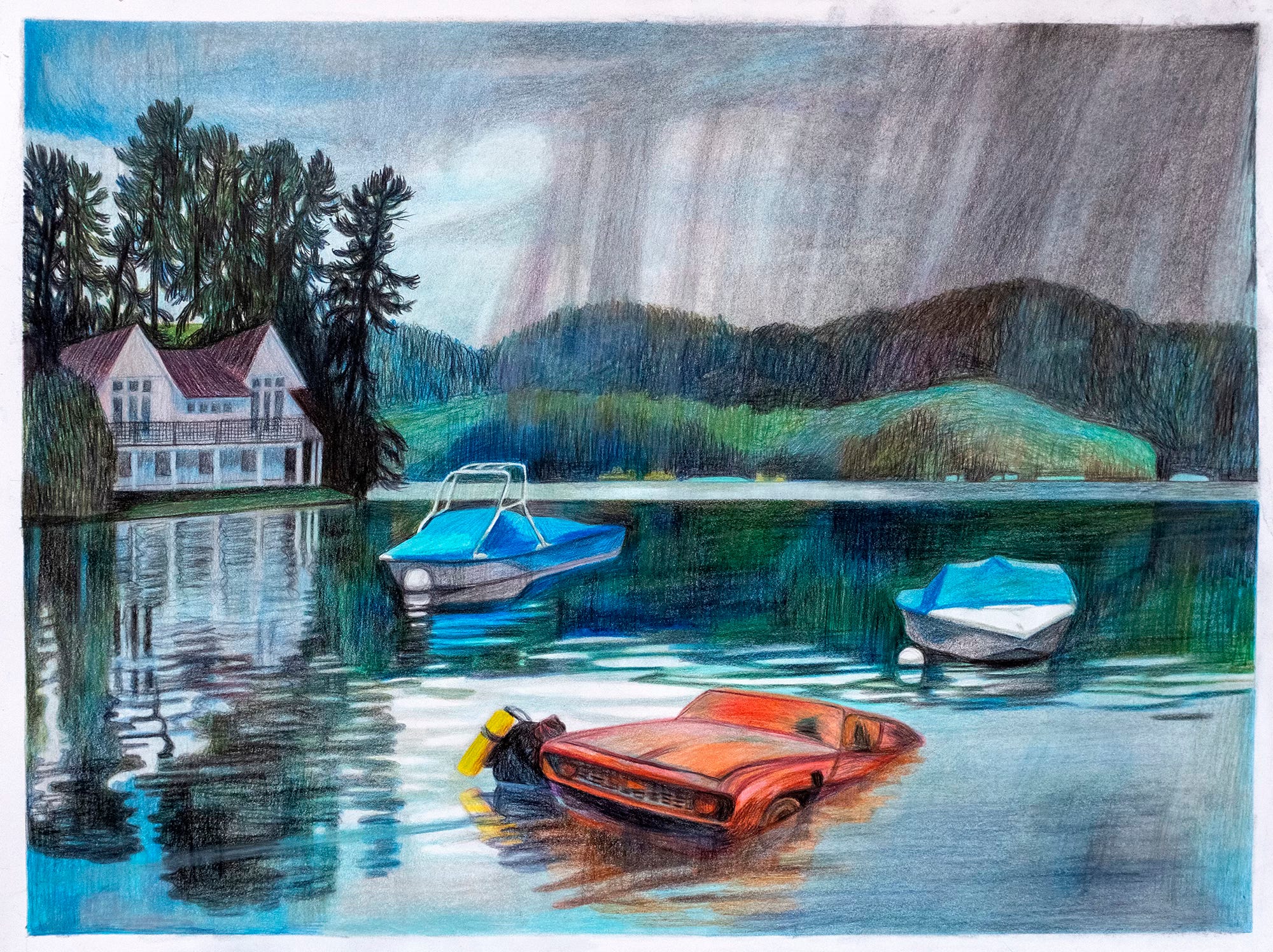 Je peux ainsi y ajouter une narration, j’invente une histoire autour d’un lieu, a posteriori. Dans ces dessins de la série Lake George, j’ai imaginé des voitures englouties, symbolisant un temps révolu, une mémoire oubliée.